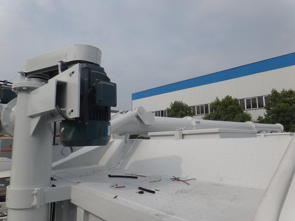 液壓式散裝飼料運(yùn)輸車的飼料罐架設(shè)在卡車的底盤上,專用設(shè)施由罐體總成、輸送系統(tǒng)(水平卸料系統(tǒng)、垂直卸料系統(tǒng)以及活動卸料系統(tǒng)組成)、液壓系統(tǒng)(高壓油泵經(jīng)管路與分配閥連接該閥的三個輸出端分別是轉(zhuǎn)角液壓馬達(dá)、升降油缸以及串聯(lián)在一起的水平卸料、垂直卸料、活動卸料液壓馬達(dá))、電動系統(tǒng)、氣動分倉機(jī)構(gòu)等組成。在罐體底部設(shè)有閘門,在閘門下面裝有水平螺旋輸送器(俗稱水平攪籠),由取力器由汽車變速箱輸出動力驅(qū)動,再傳動高壓油泵以驅(qū)動液壓系統(tǒng),液壓馬達(dá)通過傳動裝置帶動水平螺旋輸送器的葉片軸及葉片旋轉(zhuǎn), 經(jīng)活動輸送系統(tǒng)(俗稱活動攪籠)以將飼料輸出。車頂平置的一根活動卸料絞龍可自由回轉(zhuǎn)和抬升,運(yùn)輸時,頂部的螺旋管平臥在罐頂;卸料時則抬起,使管端的出料口與畜禽飼養(yǎng)場貯料罐頂部的進(jìn)料門相接、對準(zhǔn),完成卸料。進(jìn)口國產(chǎn)化液壓件,容易維修保養(yǎng),液壓絞龍式:適用于無電力配套場所飼料裝卸運(yùn)輸。