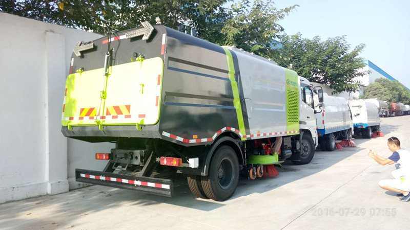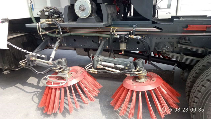 洗掃車(chē)采用中置兩刷盤(pán),中置寬吸盤(pán),配上具有防撞避障功能的V型高壓沖水架,組成一條大于3.5米的沖洗清掃帶。采用康明斯EQ6BT5.9-118型副發(fā)動(dòng)機(jī)作為動(dòng)力的驅(qū)動(dòng)裝置橫置在車(chē)架中部,具有氣動(dòng)離合裝置控制的抽吸風(fēng)機(jī)布置在動(dòng)力倉(cāng)的左側(cè)。采用不銹鋼材料加工而成的水箱與垃圾箱均為采用方形瓦棱結(jié)構(gòu)。水箱分為兩部位,一部分為前置獨(dú)立水箱,裝配在動(dòng)力倉(cāng)的前部;另一部分為設(shè)置在垃圾箱前部的水箱,可隨垃圾箱與動(dòng)力倉(cāng)罩同時(shí)升降。具有舉升功能的垃圾箱內(nèi)裝配有高壓沖洗噴頭,使得卸料更為輕松、干凈徹底。能夠隨垃圾箱體舉升的動(dòng)力倉(cāng)罩可使動(dòng)力系統(tǒng)的維修保養(yǎng)極為便利。采用歐美地區(qū)的名優(yōu)配套部件,使得整車(chē)性能更為優(yōu)良,工作更為可靠。