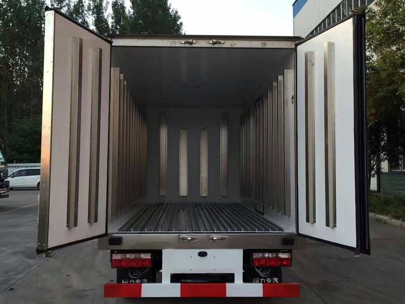 冷藏箱體尺寸長×寬×高為:4000X1880X1850,12.48立方,廂體厚度為8厘米。內(nèi)外板材采用冷藏車專用玻璃鋼,(可反射陽光),中間夾層為聚氨酯發(fā)泡隔熱材料,(防火阻燃隔熱)大型千噸壓力機(jī)壓制而成,配置箱體全為不銹鋼鎖件,不銹鋼包角,不銹鋼門框,帶有頂燈及防撞塊。我廠的冷藏保溫車保溫材料選用進(jìn)口級(jí)別XPS,吸水率≤1,導(dǎo)熱系數(shù)≤0.028W/mk,抗壓≥150Kpa,密度30~45kg/m3,使用國際上最為先進(jìn)的第五代全封閉聚氨酯板塊粘接結(jié)構(gòu),廂板表面材料有玻璃鋼、不銹鋼、鋁合金、彩鋼板等材料可供選擇,廂體成型后具有質(zhì)量輕,保溫系數(shù)高,抗沖擊力強(qiáng),無滲漏等優(yōu)點(diǎn),對(duì)大氣、水和酸、堿、鹽等介質(zhì)具有良好的耐腐蝕性和抗老化性。通過優(yōu)化設(shè)計(jì),降低了整車質(zhì)心,增大了有效容積。經(jīng)測試,整車綜合節(jié)能率,使用壽命,比一般冷藏保溫廂高1~2倍。