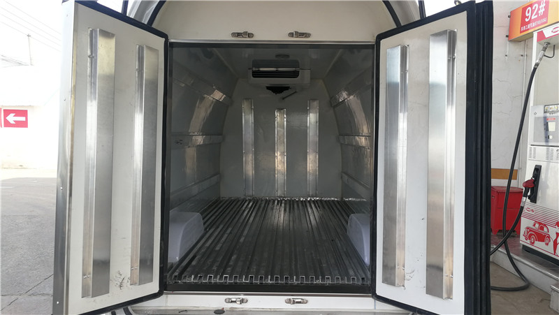 箱體尺寸為2930x1360x1450約5.5方。內(nèi)膽圓弧式廂體,內(nèi)外板材采用冷藏車(chē)專(zhuān)用玻璃鋼,(可反射陽(yáng)光),中間夾層為聚氨酯保溫隔熱材料,(防火阻燃隔熱),配置箱體全為不銹鋼鎖件,不銹鋼包角,不銹鋼門(mén)框,帶有頂燈及防撞塊。廂板表面材料有玻璃鋼、不銹鋼、鋁合金、彩鋼板等材料可供選擇,廂體成型后具有質(zhì)量輕,保溫系數(shù)高,抗沖擊力強(qiáng),無(wú)滲漏等優(yōu)點(diǎn),對(duì)大氣、水和酸、堿、鹽等介質(zhì)具有良好的耐腐蝕性和抗老化性。通過(guò)優(yōu)化設(shè)計(jì),降低了整車(chē)質(zhì)心,增大了有效容積。經(jīng)測(cè)試,整車(chē)綜合節(jié)能率,使用壽命,比一般冷藏保溫廂高1~2倍。 制冷機(jī)組:選裝國(guó)產(chǎn)-5度保鮮制冷機(jī)組,-15度冷凍制冷機(jī)組。