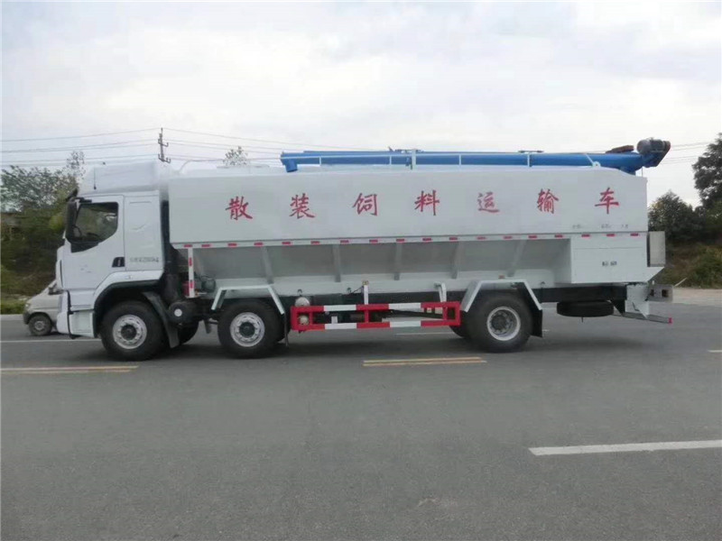 散裝飼料車的飼料罐架設在卡車的底盤上,專用設施由罐體總成、輸送系統(tǒng)(水平卸料系統(tǒng)、垂直卸料系統(tǒng)以及活動卸料系統(tǒng)組成)、散裝飼料車罐液壓系統(tǒng)(高壓油泵經管路與分配閥連接該閥的三個輸出端分別是轉角液壓馬達、升降油缸以及串聯(lián)在一起的水平卸料、垂直卸料、活動卸料液壓馬達)、散裝飼料車罐電動系統(tǒng)、氣動分倉機構等組成。在罐體底部設有閘門,在閘門下面裝有水平螺旋輸送器(俗稱水平攪籠),由取力器由汽車變速箱輸出動力驅動,再傳動高壓油泵以驅動液壓系統(tǒng),散裝飼料車罐液壓馬達通過傳動裝置帶動水平螺旋輸送器的葉片軸及葉片旋轉,經活動輸送系統(tǒng)(俗稱活動攪籠)以將飼料輸出。車頂平置的一根活動卸料絞龍可自由回轉和抬升,運輸時頂部的螺旋管平臥在罐頂;卸料時則抬起,散裝飼料車罐使管端的出料口與畜禽飼養(yǎng)場貯料罐頂部的進料門相接、對準,完成卸料。