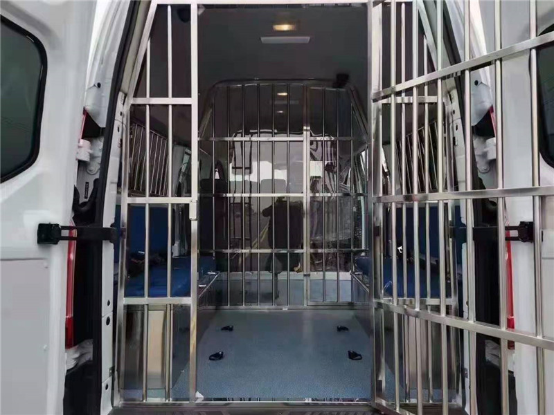 304不銹鋼囚籠 ,2個(gè)監(jiān)控?cái)z像頭(前后監(jiān)控),腳鐐固定環(huán) ,長(zhǎng)條翻板座椅 ,貼“公安”標(biāo)識(shí) ,警用車外觀標(biāo)識(shí) ,寬后腳踏板。加裝等離子殺菌凈化系統(tǒng) 。