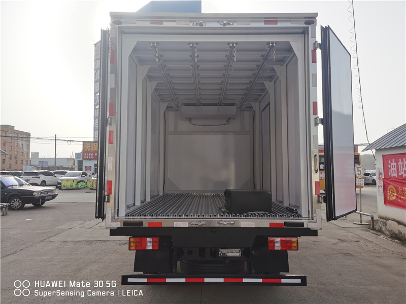 冷藏車箱體是采用國際通用三明治工藝+我廠專利木質(zhì)工藝(龍骨連接鑲?cè)氕h(huán)保防水木材起保溫耐腐蝕作用)、斷橋隔熱技術(shù)!生產(chǎn)線是國際最先進(jìn)18米大型復(fù)合板材生產(chǎn)線,壓板臺(tái)面生產(chǎn)前機(jī)器自動(dòng)吸塵干凈,保證壓板機(jī)一次壓制成型,其生產(chǎn)設(shè)備及技術(shù)均領(lǐng)先同行業(yè)標(biāo)準(zhǔn),箱體外形美觀,整體質(zhì)量輕,強(qiáng)度高,無滲漏特點(diǎn),箱體堅(jiān)固耐用,保溫效果高,保溫效果達(dá)到國家A級(jí)標(biāo)準(zhǔn)。箱體內(nèi)部加裝可拆卸式肉鉤骨架,地板加裝通風(fēng)槽。安裝國產(chǎn)冷凍-15度制冷機(jī)組,最低溫度可達(dá)-15度,可根據(jù)運(yùn)輸貨物需求進(jìn)行調(diào)節(jié)。