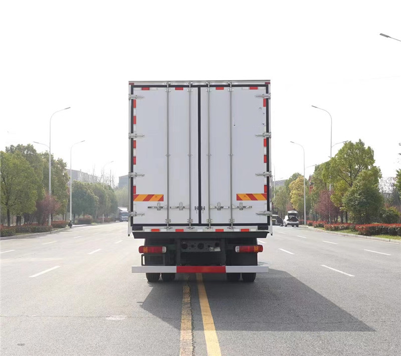 重汽汕德卡G5高頂雙臥大單橋9米6冷藏車(chē)專(zhuān)用配置: 冷藏箱體尺寸:9400×2410×2500(mm),《斷橋隔溫工藝、整體結(jié)構(gòu)框架》;內(nèi)外面料為3mm新款玻璃鋼;側(cè)板+頂板:龍骨斷橋?yàn)樗赡緩?fù)合板;木質(zhì)隔溫結(jié)構(gòu);夾心為聚苯乙烯保溫材料;全密封雙組合聚氨酯膠粘連;廂體厚度為8cm;頂板10cm厚,底板12cm厚,鍍鋅包角;最新款鋁合金包邊型材;型材局部厚度為4mm(鋼制鉚釘加固);廂體內(nèi)部采用2個(gè)LED照明燈及廂體示寬燈;后門(mén)框?yàn)?mm厚不銹鋼材質(zhì);門(mén)框密封條為三元乙丙橡膠材質(zhì);加厚型不銹鋼合頁(yè)及鎖件;副梁為Q700車(chē)用大梁鋼;15mm厚大梁墊皮;加裝防撞膠塊;不銹鋼門(mén)鎖件,配后雙開(kāi)門(mén)。底板為玻璃鋼,單側(cè)門(mén)。