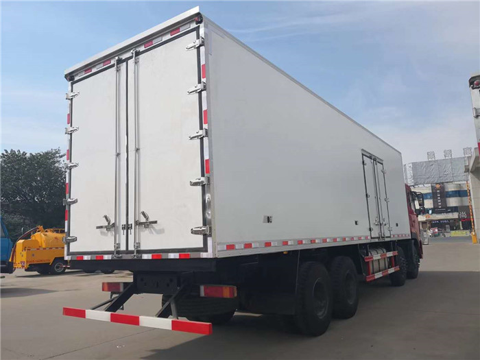 箱體尺寸長×寬×高為:9400×2400×2450 計55立方,廂體采用程力晶龍新工藝制作。冷藏廂體內(nèi)外板材采用冷藏車專用玻璃鋼,(可反射陽光),中間夾層為8CM聚氨酯發(fā)泡隔熱材料,(防火阻燃隔熱),千噸壓機廂板生產(chǎn)線壓制而成,配置箱體全為不銹鋼鎖件,不銹鋼包角,不銹鋼門框,帶有頂燈及防撞塊。廂體底部為玻璃鋼板,加裝鋁合金材質(zhì)的通風槽。我廠的冷藏保溫車保溫材料選用進口級別XPS,吸水率≤1,導熱系數(shù)≤0.028W/mk,抗壓≥150Kpa,密度30~45kg/m3,使用國際上最為先進的第五代全封閉聚氨酯板塊粘接結構,廂板表面材料有玻璃鋼、不銹鋼、鋁合金、彩鋼板等材料可供選擇,廂體成型后具有質(zhì)量輕,保溫系數(shù)高,抗沖擊力強,無滲漏等優(yōu)點,對大氣、水和酸、堿、鹽等介質(zhì)具有良好的耐腐蝕性和抗老化性 。通過優(yōu)化設計,降低了整車質(zhì)心,增大了有效容積。經(jīng)測試,整車綜合節(jié)能率,使用壽命,比一般冷藏保溫廂高1~2倍。