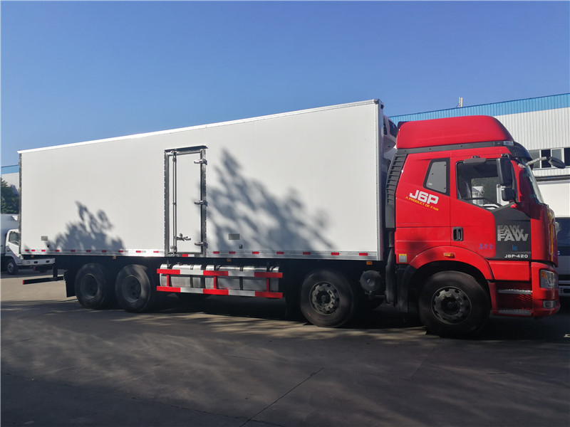 解放放J6P前四后八420馬力冷藏車標(biāo)準(zhǔn)配置:箱體尺寸長×寬×高為:9600x2402x2550 ,廂體采用程力新工藝制作。冷藏廂體內(nèi)外板材采用冷藏車專用玻璃鋼,(可反射陽光),中間夾層為8CM聚氨酯發(fā)泡隔熱材料,(防火阻燃隔熱),千噸壓機(jī)廂板生產(chǎn)線壓制而成,配置箱體全為不銹鋼鎖件,不銹鋼包角,不銹鋼門框,帶有頂燈及防撞塊。廂體底部為玻璃鋼板,加裝鋁合金材質(zhì)的通風(fēng)槽。我廠的冷藏保溫車保溫材料選用進(jìn)口級別XPS,吸水率≤1,導(dǎo)熱系數(shù)≤0.028W/mk,抗壓≥150Kpa,密度30~45kg/m3,使用國際上最為先進(jìn)的第五代全封閉聚氨酯板塊粘接結(jié)構(gòu),廂板表面材料有玻璃鋼、不銹鋼、鋁合金、彩鋼板等材料可供選擇,廂體成型后具有質(zhì)量輕,保溫系數(shù)高,抗沖擊力強(qiáng),無滲漏等優(yōu)點,對大氣、水和酸、堿、鹽等介質(zhì)具有良好的耐腐蝕性和抗老化性 。通過優(yōu)化設(shè)計,降低了整車質(zhì)心,增大了有效容積。經(jīng)測試,整車綜合節(jié)能率,使用壽命,比一般冷藏保溫廂高1~2倍。