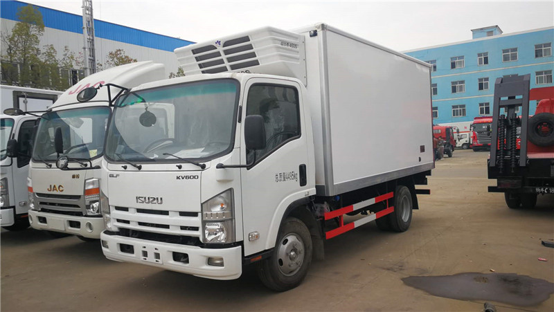 五十鈴KV600國五4米2豬白條肉掛鉤冷藏車底盤配置:五十鈴KV600寬體駕駛室,駕駛室可前翻,可座3人,慶鈴五十鈴國五3.0排量130馬力國五柴油發(fā)動機(jī),型號4KH1CN5HS ,五十鈴5檔變速箱,油剎,駕駛室?guī)г瓘S空調(diào),方向助力,ABS,2.3噸前橋,3.5噸后橋,7.00鋼絲胎。