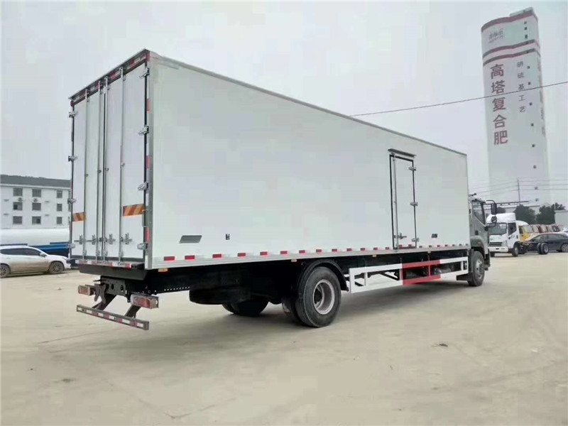 標(biāo)準(zhǔn)配置:箱體尺寸長(zhǎng)×寬×高為:9580×2450×2500,約58.6立方,廂體厚度為8厘米。冷藏廂體內(nèi)外板材采用冷藏車(chē)專(zhuān)用玻璃鋼,(可反射陽(yáng)光),中間夾層為聚氨酯發(fā)泡隔熱材料,(防火阻燃隔熱),千噸壓機(jī)壓制而成,配置箱體全為不銹鋼鎖件,不銹鋼包角,不銹鋼門(mén)框,帶有頂燈及防撞塊。廂體底部為鋁花紋板。我廠的冷藏保溫車(chē)保溫材料選用進(jìn)口級(jí)別XPS,吸水率≤1,導(dǎo)熱系數(shù)≤0.028W/mk,抗壓≥150Kpa,密度30~45kg/m3,使用國(guó)際上最為先進(jìn)的第五代全封閉聚氨酯板塊粘接結(jié)構(gòu),廂板表面材料有玻璃鋼、不銹鋼、鋁合金、彩鋼板等材料可供選擇,廂體成型后具有質(zhì)量輕,保溫系數(shù)高,抗沖擊力強(qiáng),無(wú)滲漏等優(yōu)點(diǎn),對(duì)大氣、水和酸、堿、鹽等介質(zhì)具有良好的耐腐蝕性和抗老化性 。通過(guò)優(yōu)化設(shè)計(jì),降低了整車(chē)質(zhì)心,增大了有效容積。經(jīng)測(cè)試,整車(chē)綜合節(jié)能率,使用壽命,比一般冷藏保溫廂高1~2倍。廂體內(nèi)部選裝肉鉤導(dǎo)軌,地板通風(fēng)槽,溫濕度記錄儀等設(shè)備。